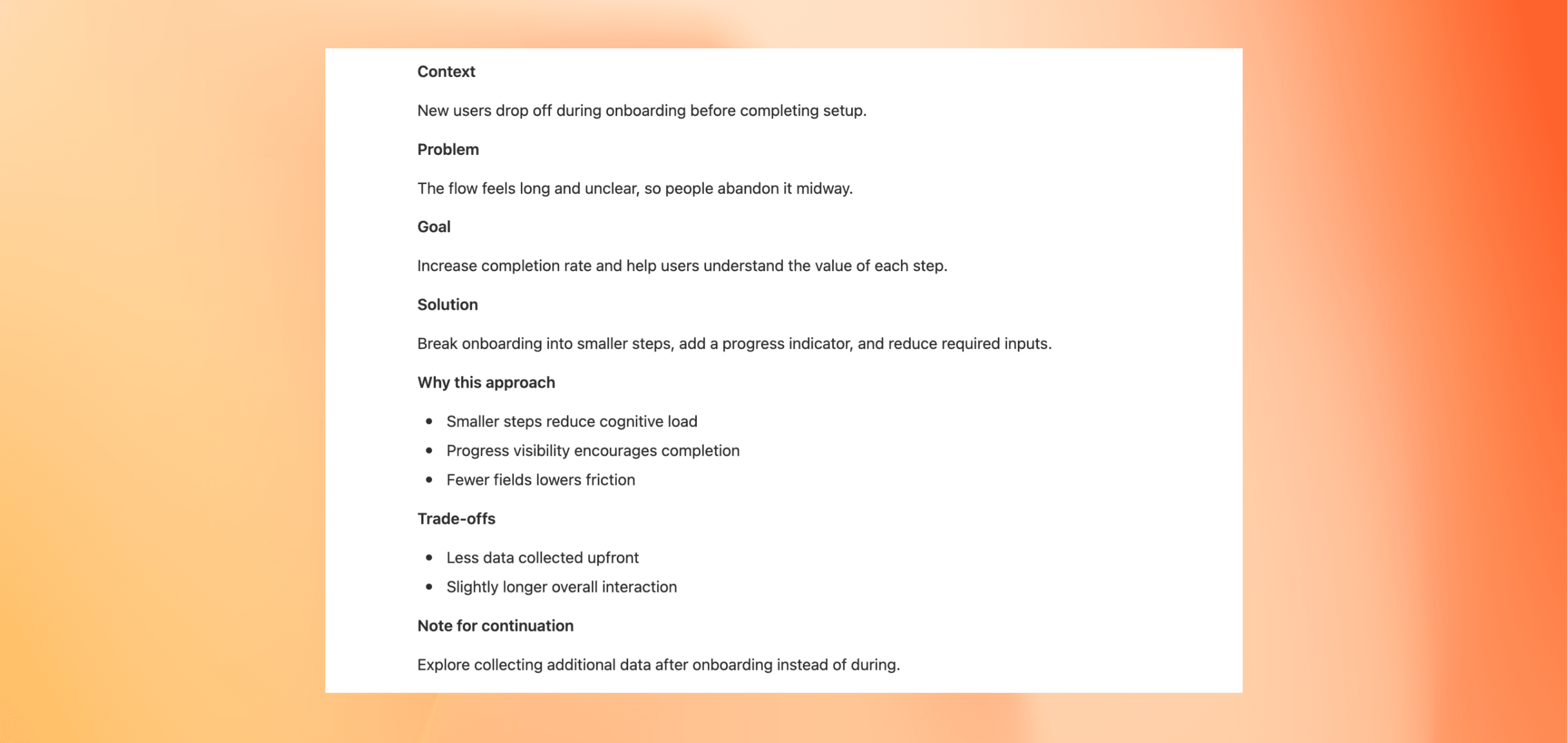 Keep it clear and direct. Avoid vague claims like “improves UX.” Instead, name what changes and how it helps. Write it so someone who wasn’t in the room can still follow the logic.